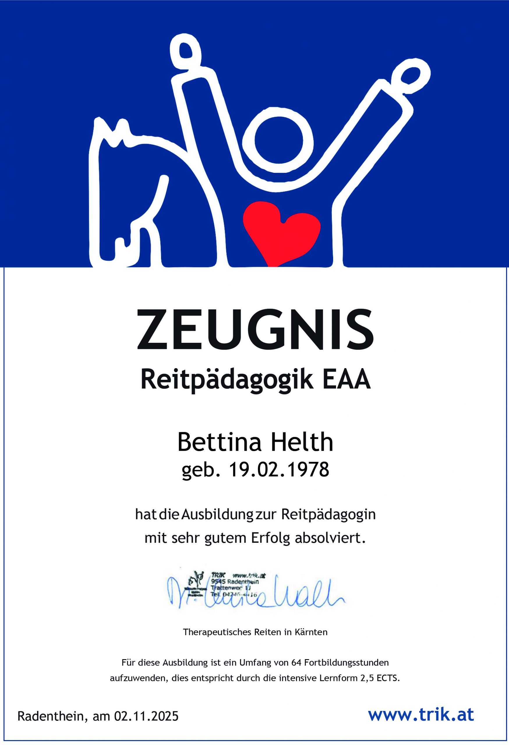 Im November hat Bettina ihre Ausbildung zur Reitpädagogin EAA (Equine Assisted Activities) mit sehr gutem Erfolg abgeschlossen. Dabei handelt es sich um eine spezialisierte Form der pädagogischen Arbeit mit dem Pferd, die Kinder, Jugendliche und Erwachsene in ihrer persönlichen Entwicklung gezielt unterstützt. Im Mittelpunkt stehen die Stärkung von Selbstvertrauen, sozialen Kompetenzen und emotionaler Ausgeglichenheit sowie die Förderung von Wahrnehmung, Konzentration und Motorik. Durch den respektvollen und achtsamen Umgang mit dem Pferd entstehen wertvolle Lernerfahrungen, die nachhaltig wirken und den Transfer in den Alltag erleichtern.